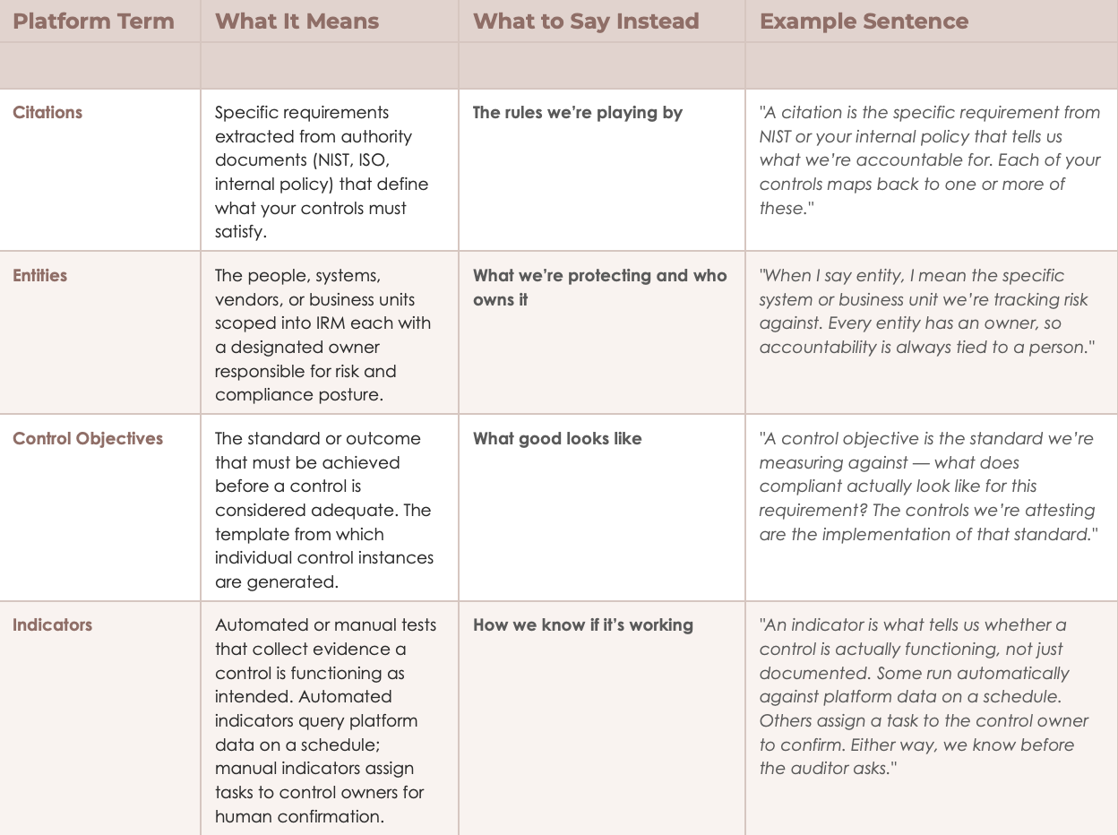 A few notes on using these translations effectively. First, lead with the stakeholder frame before you introduce the platform term not the other way around. Say “the rules we’re playing by” first, then explain that the platform calls them citations. Second, the example sentences in the table are starting points, not scripts. Adapt them to the vocabulary your org already uses. If your executives call it “control evidence,” that is your anchor word, not “indicator.” Third, consistency matters more than perfection. Pick your translation for each term and use it the same way every time across meetings, documents, and dashboards.