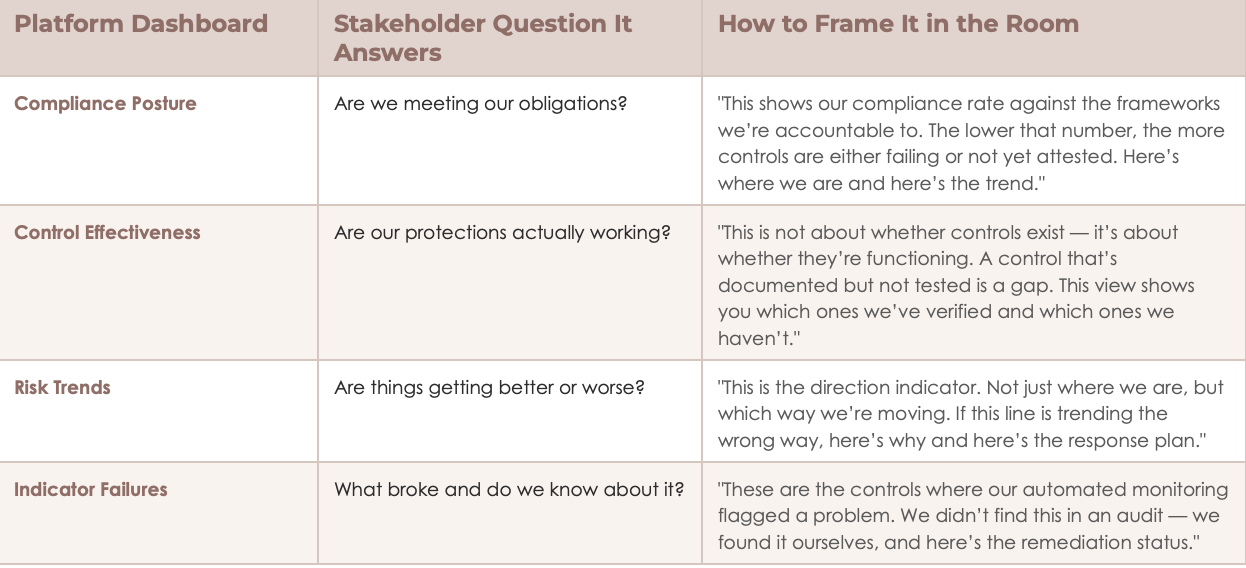 The three questions I hear most often in steering committees are: Are we meeting our obligations? Are our protections actually working? Are things getting better or worse? Those questions map to platform capabilities, but not one-to-one to the default dashboard titles.