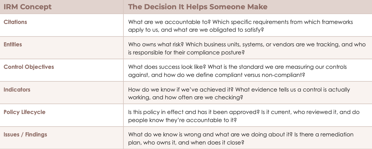 This framework is also portable. Once your stakeholders internalize it that every IRM concept exists to help someone make a specific decision they start asking better questions. Instead of “What is an indicator?” they start asking “How often are we checking?” That is the conversation you want to be in.